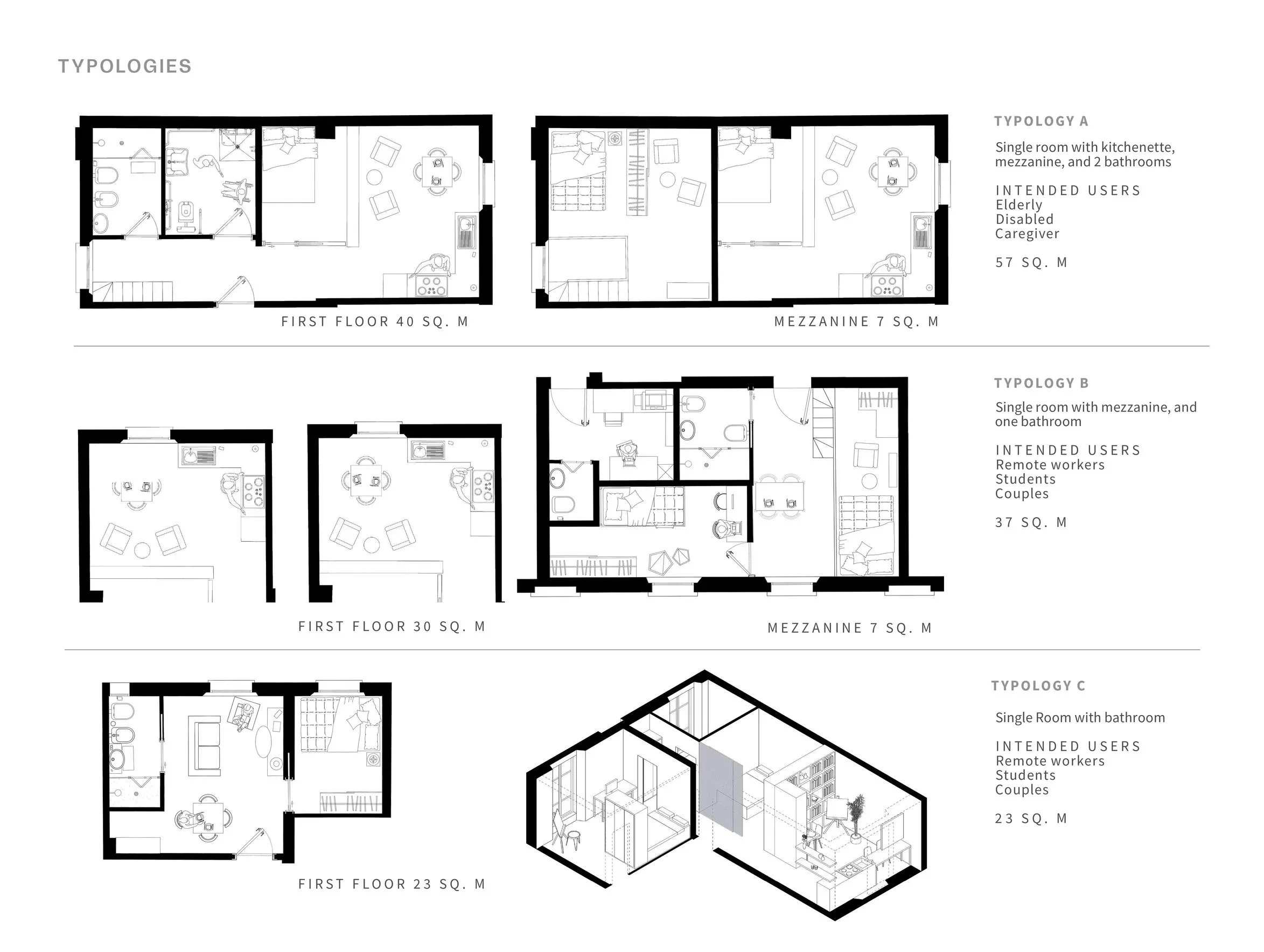 A series of unit types accommodates diverse living conditions, from compact individual spaces to multi-level configurations. Each typology is designed for flexibility, allowing spaces to evolve over time as user needs change.
