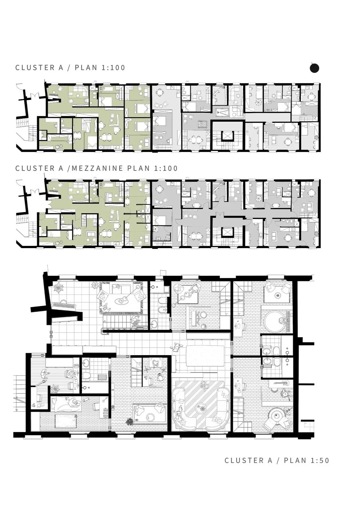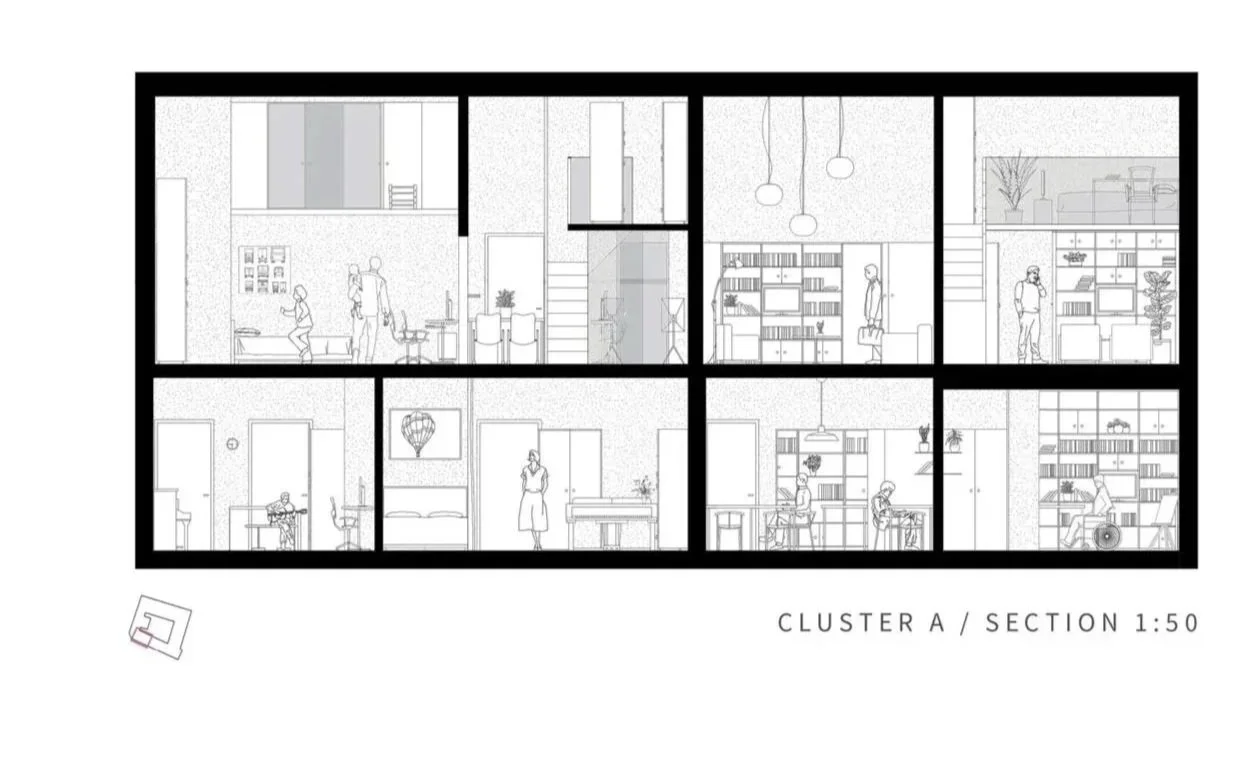 The housing is organized into modular clusters that balance private, shared, and collective spaces. Each cluster supports flexible living arrangements while maintaining strong spatial relationships between residents.